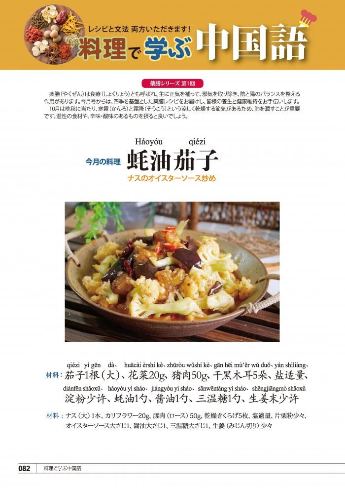 今月号から薬膳シリーズがスタート!第1回目は「ナスのオイスターソース炒め」です。10月は晩秋に当たり、寒露(かんろ)と霜降(そうこう)という涼しく乾燥する節気があるため、肺を潤すことが重要です。この時期は、温性の食材や、辛味・酸味のあるものを摂ると良いとされています。レシピとともに、食材の効能もご紹介していますので、薬膳を学んで、季節の変わり目も元気に過ごしましょう。